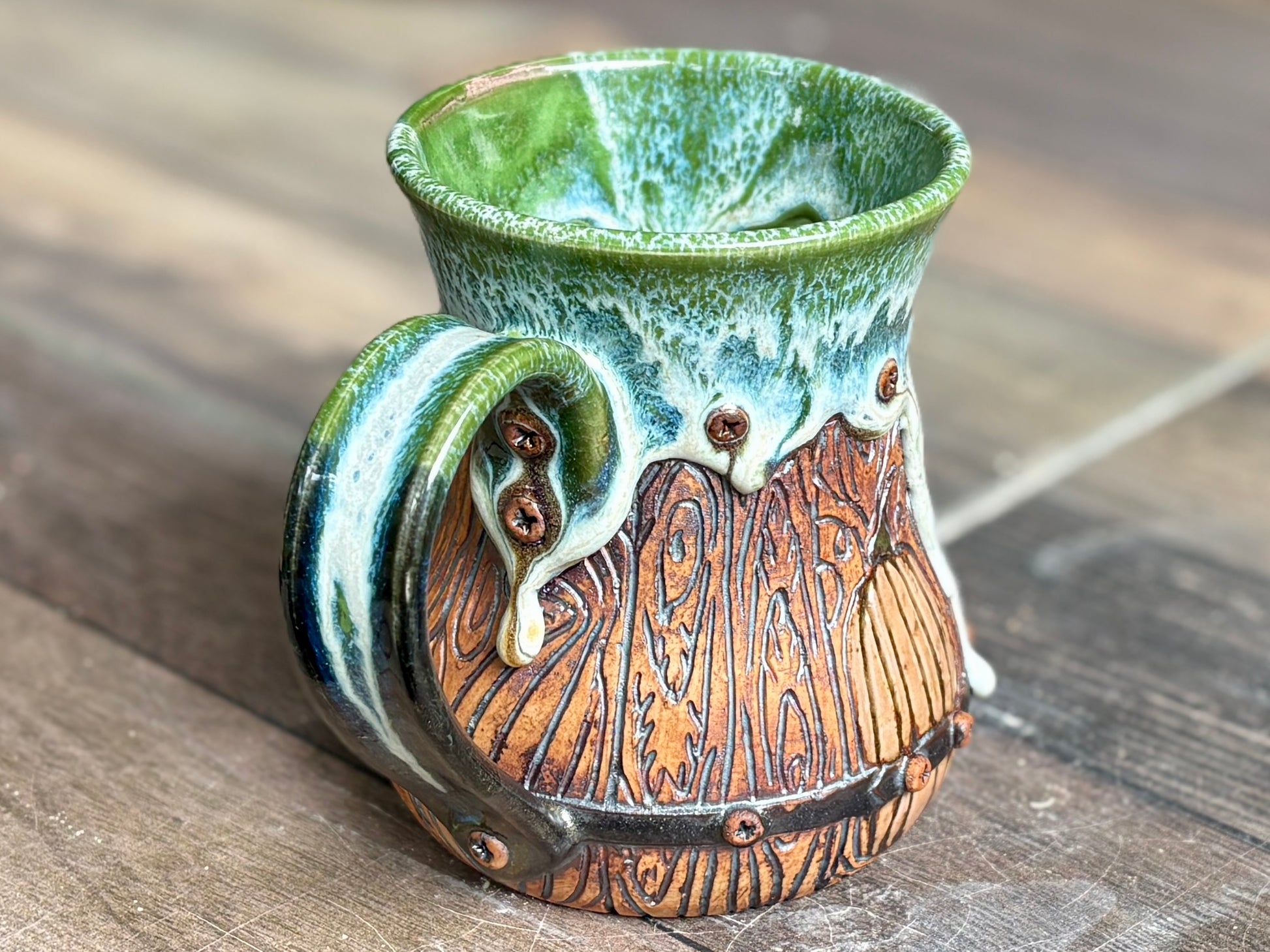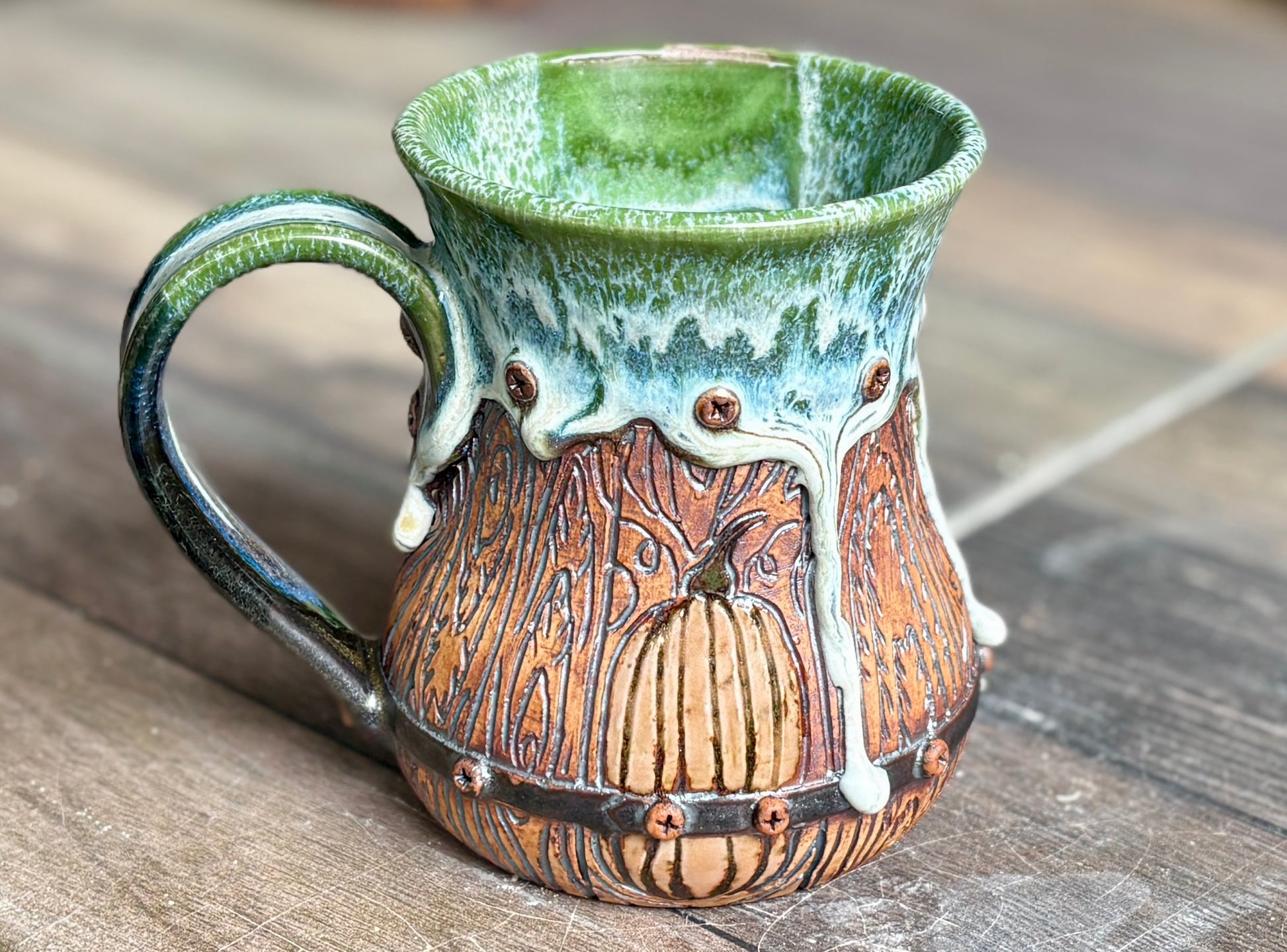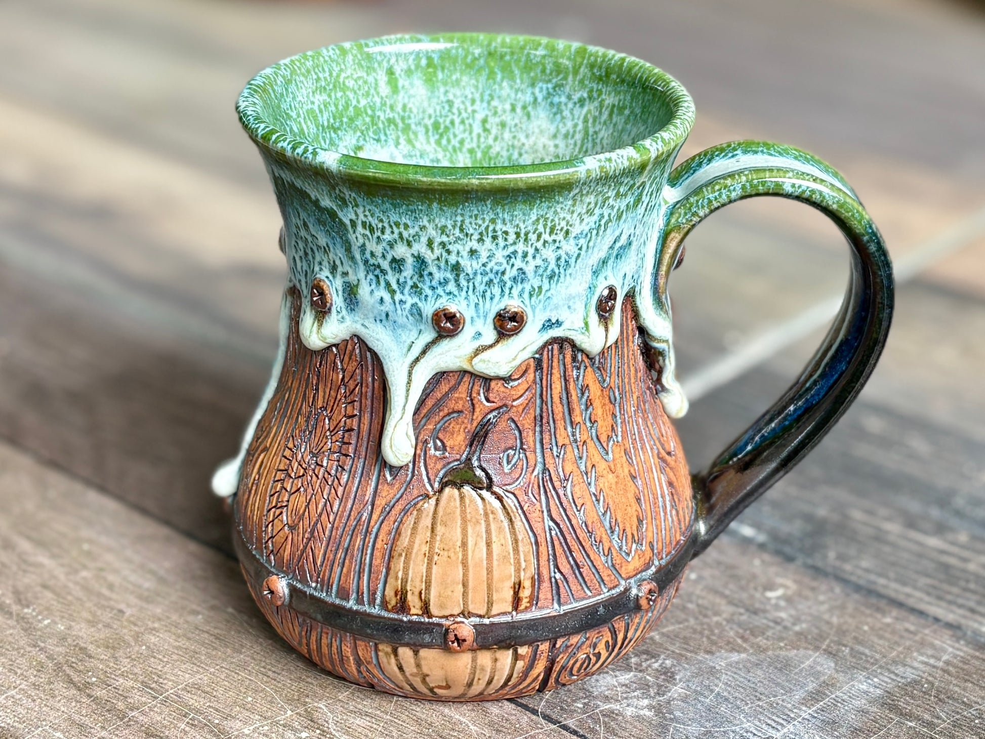 This tall, hand-carved wood grain mug comes with pumpkins carved throughout, and a gorgeous green glaze running down from the top. It's perfect for your favorite Autumn ale, or early morning brew as you feel the brisk morning air.