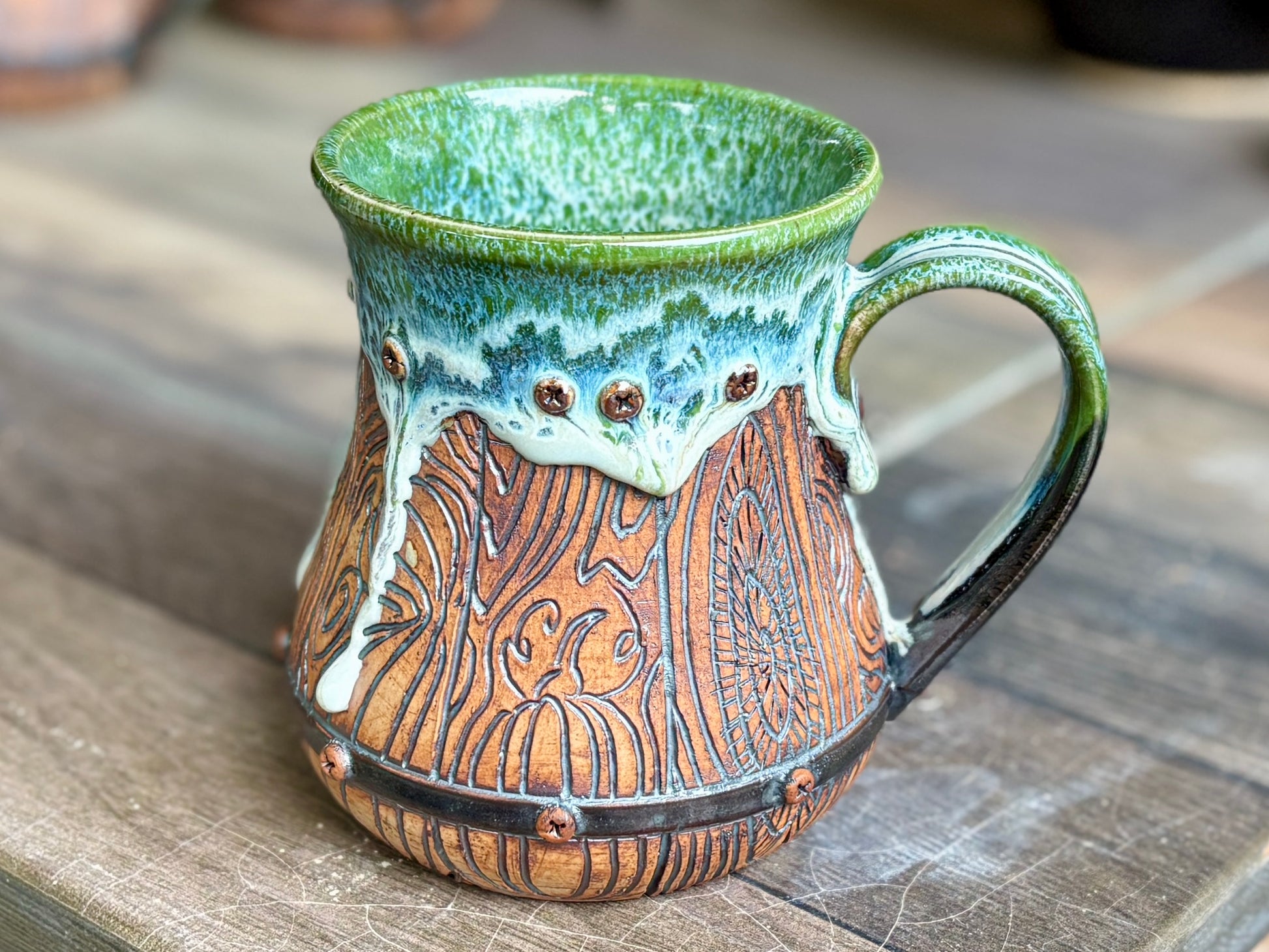 This tall, hand-carved wood grain mug comes with pumpkins carved throughout, and a gorgeous green glaze running down from the top. It's perfect for your favorite Autumn ale, or early morning brew as you feel the brisk morning air.