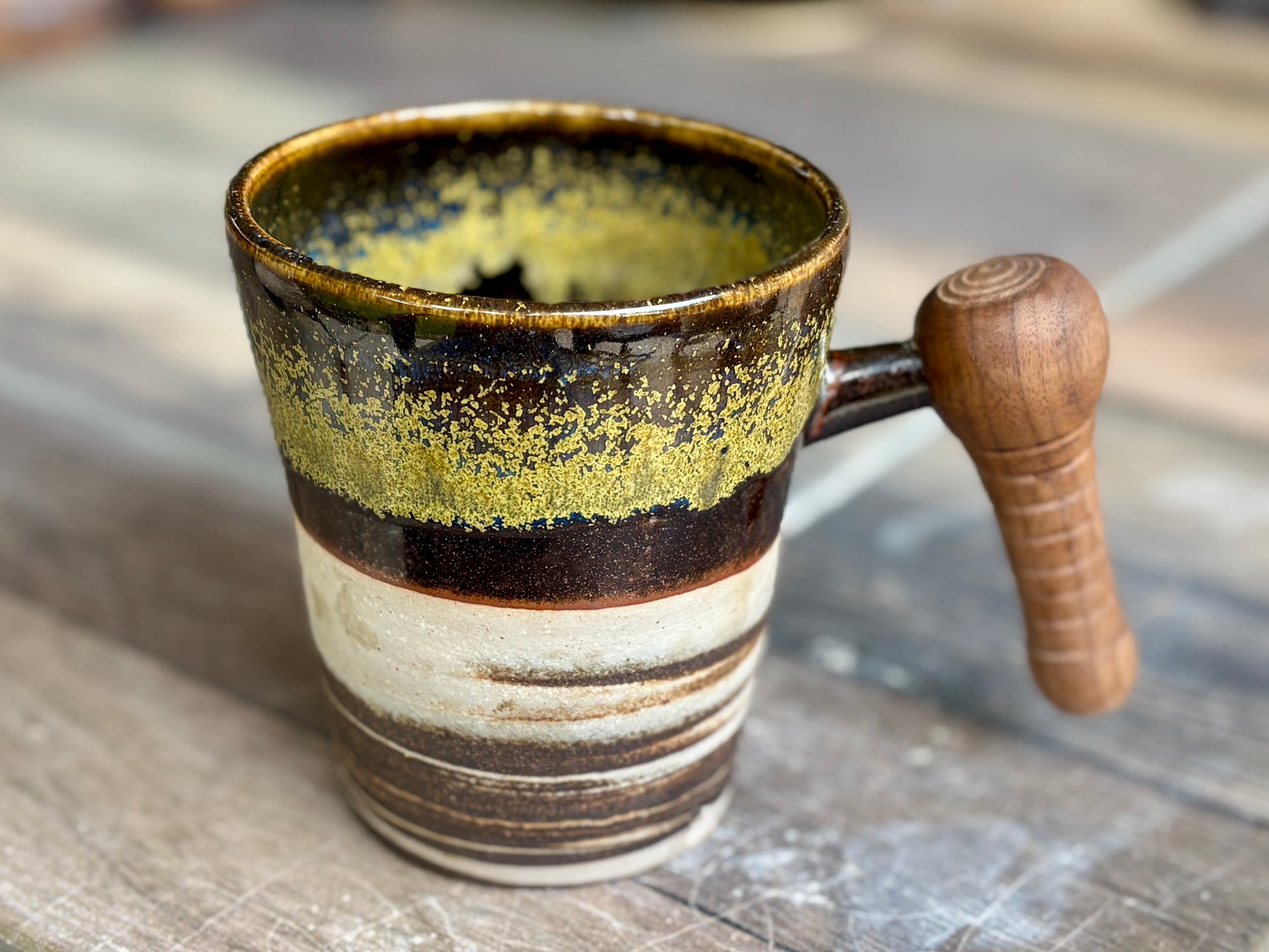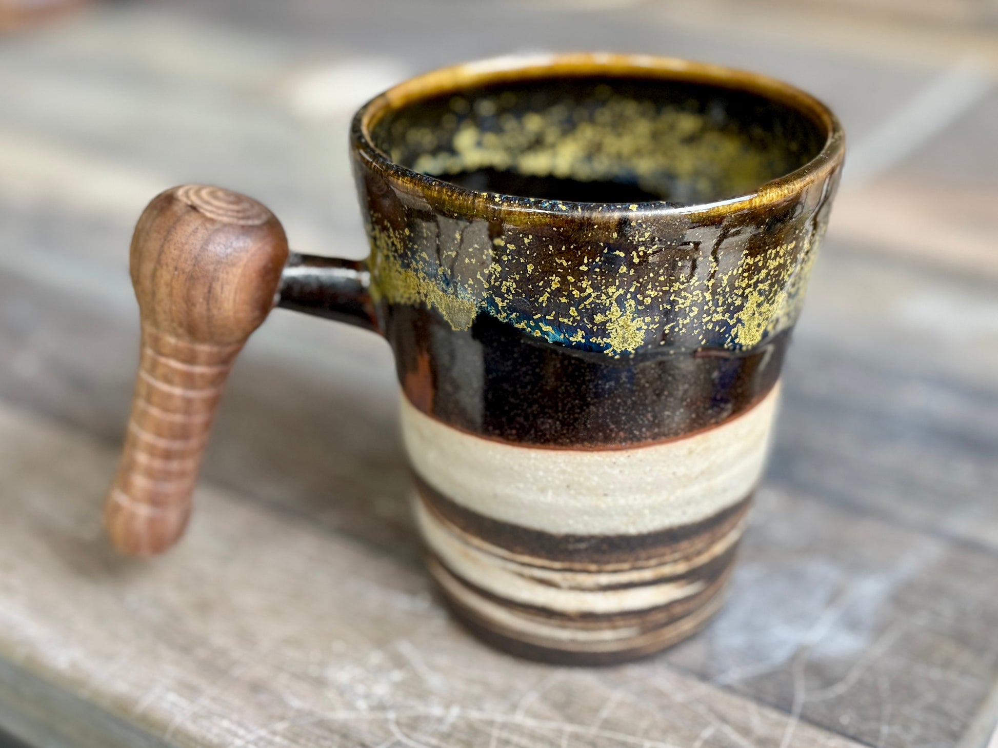 This unique mug comes with a sturdy hand-lathed wooden handle supporting a marbled clay body cask that has a golden-glaxy glaze coming down from the top of the piece. This mug is so comfortable with its earthy, natural wood handle. I was fortunate to create this piece with my good friend who is an amazing woodworker. I look forward to making more pieces like this in the future.