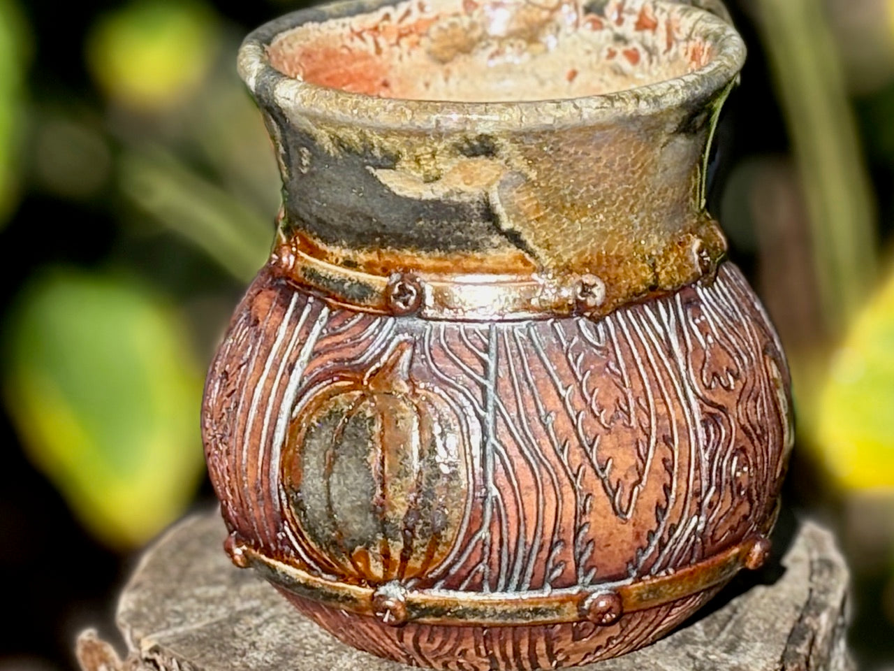 This big bellied barrel sports ghosts and pumpkins carved within the wood grains throughout the body of the piece. The pumpkin-orange glaze has a rustic, earthy look, and the handle is wide and comfortable.