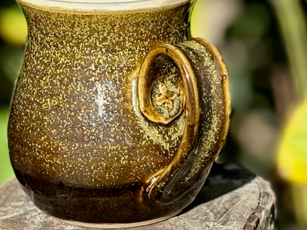With a golden dust-like glaze covering the body of this piece, this mug is lovely to look at and feels great in the hand.