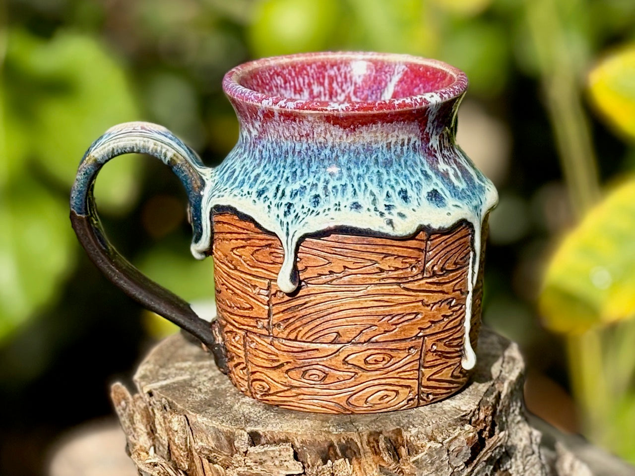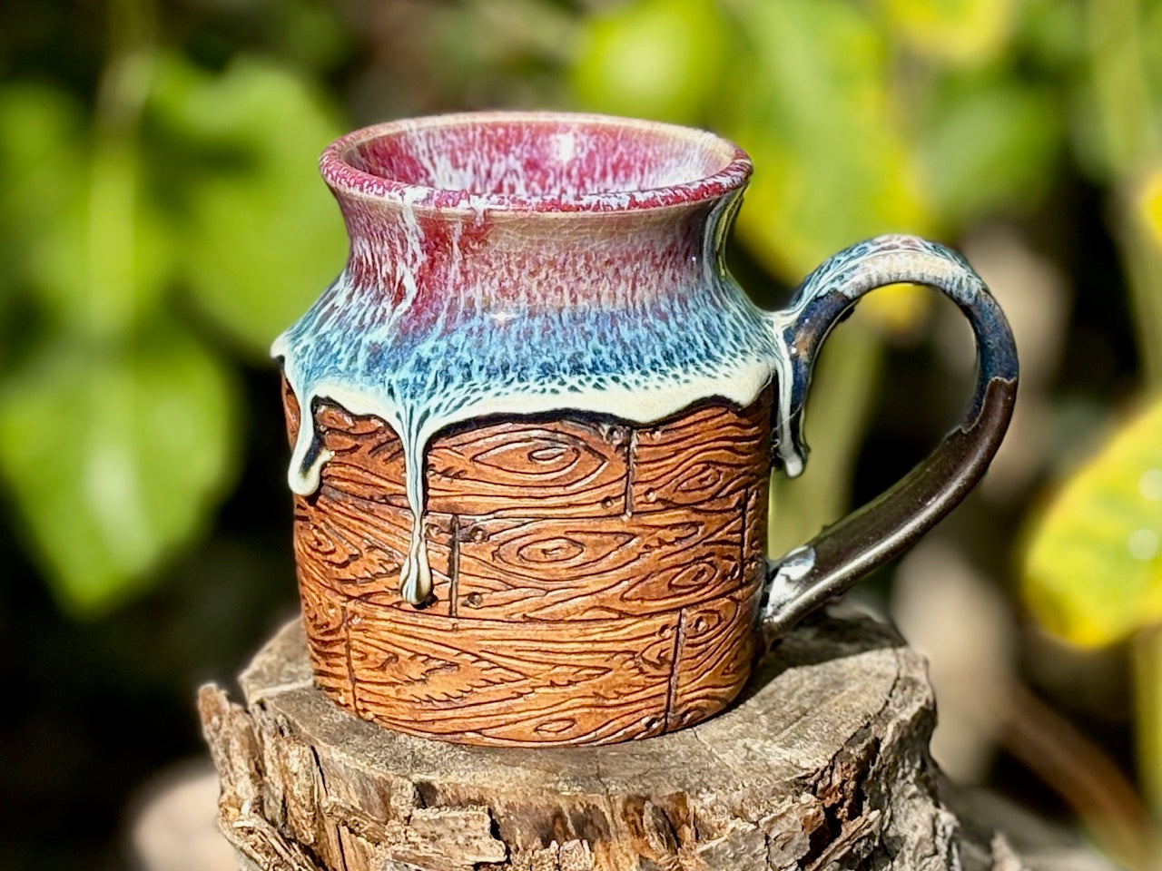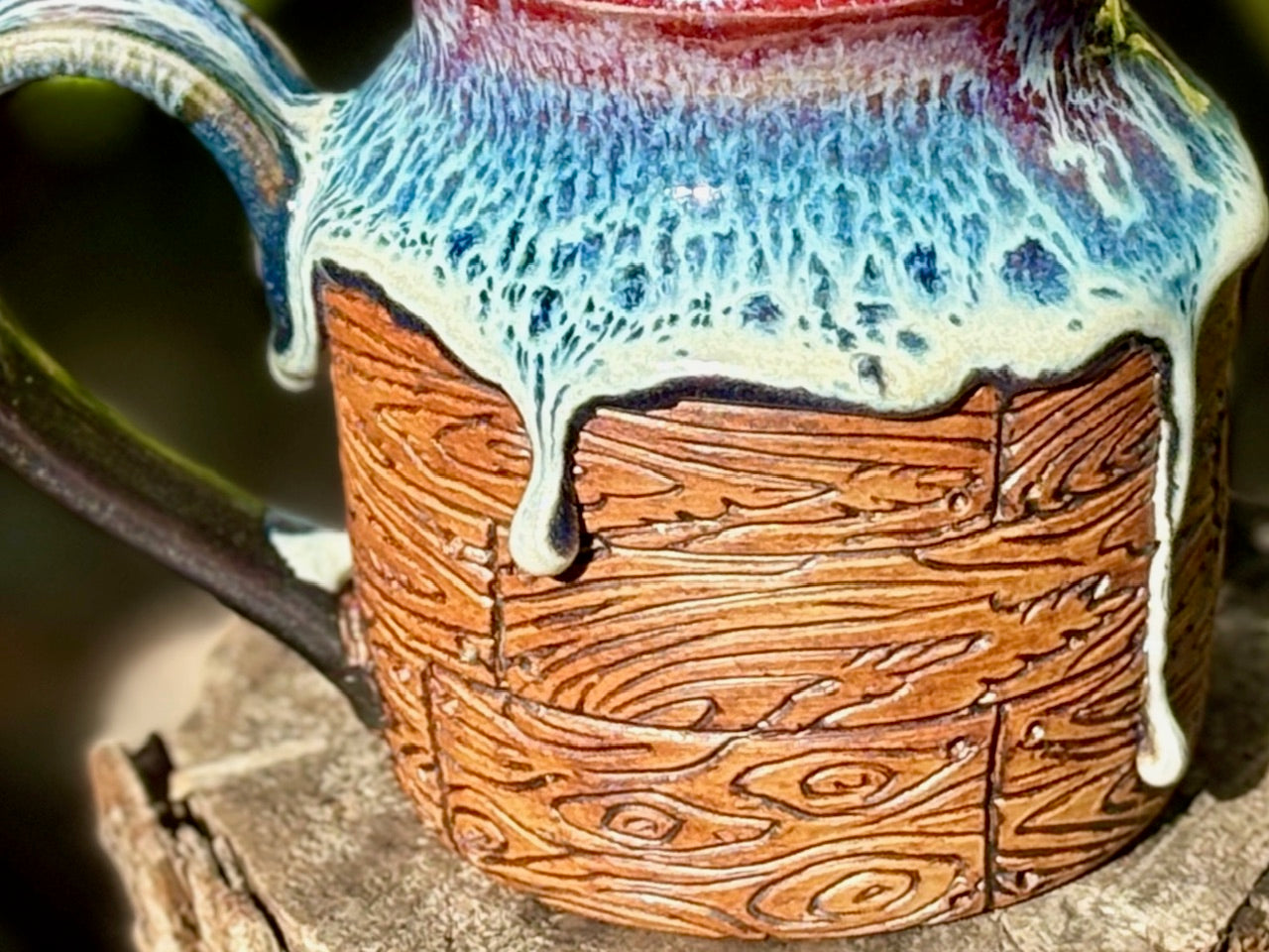This mug is a glaze gusher and I love it! This mug has a different shape than the rest of the batch, with wooden slats wrapping around the body of the piece and a wide comfy handle. With its study base this piece will comfortably hold your favorite morning brew or evening beverage.