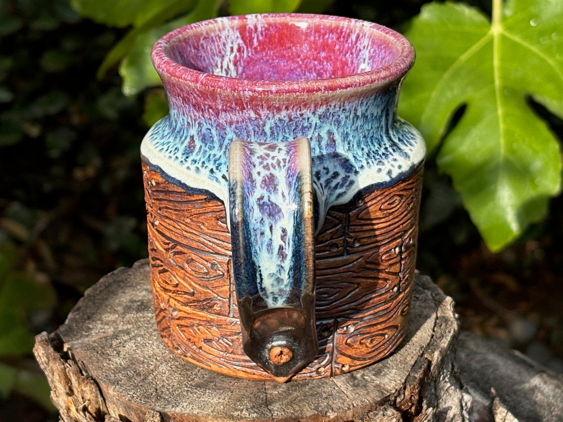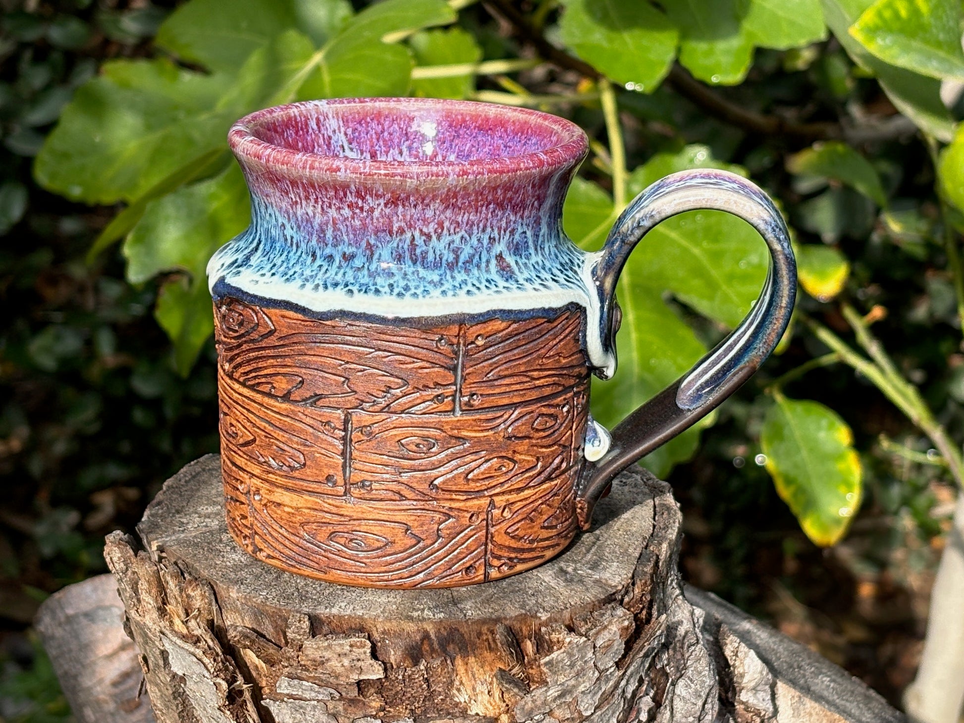 This wood grained mug comes with probably one of my most favorite new glaze combinations. I'm so happy with how this piece turned out. It's got a gorgeous red and blue glaze combination running down the top and sports a super snug handle that will make you want to use this mug everyday!
