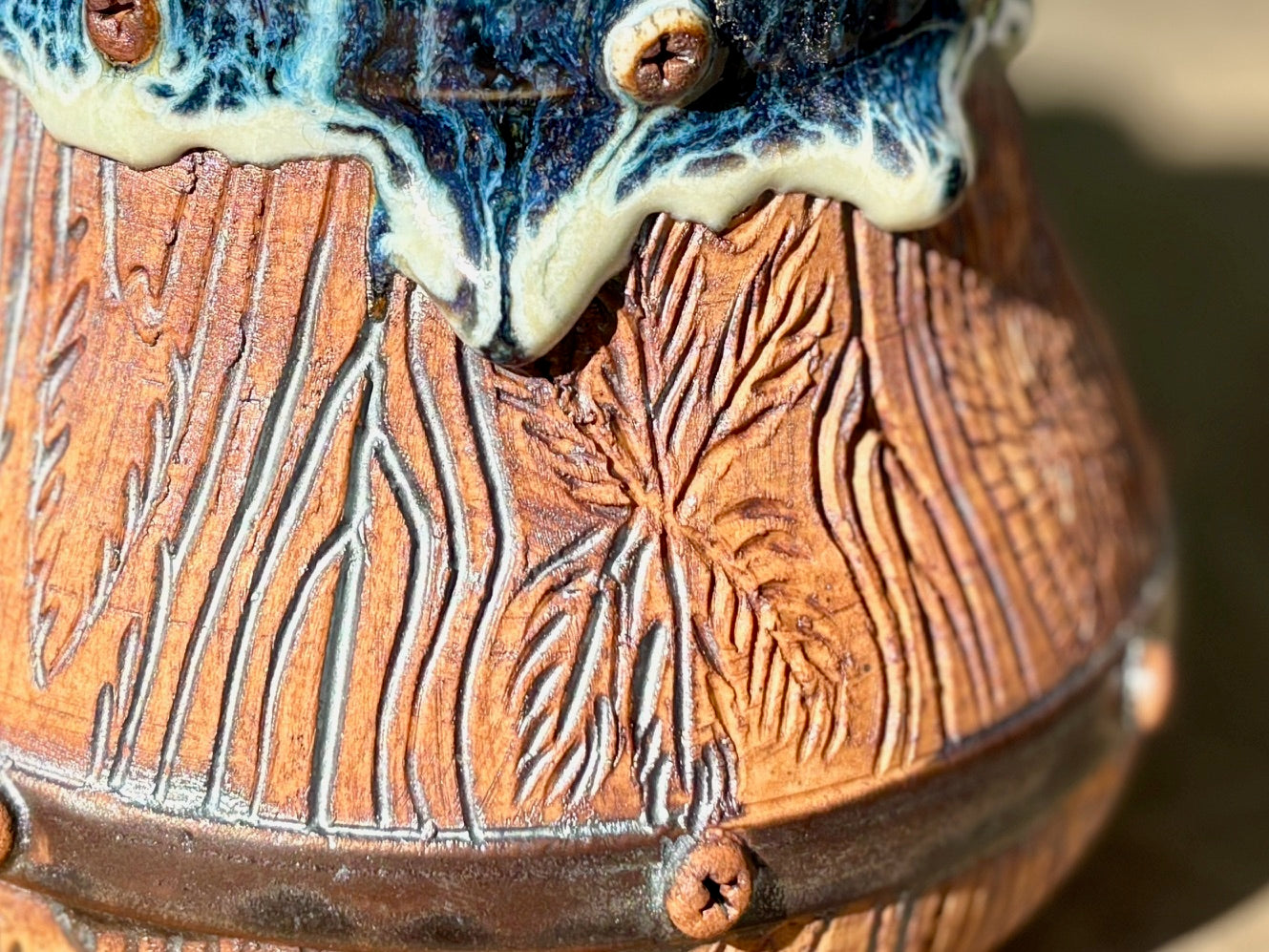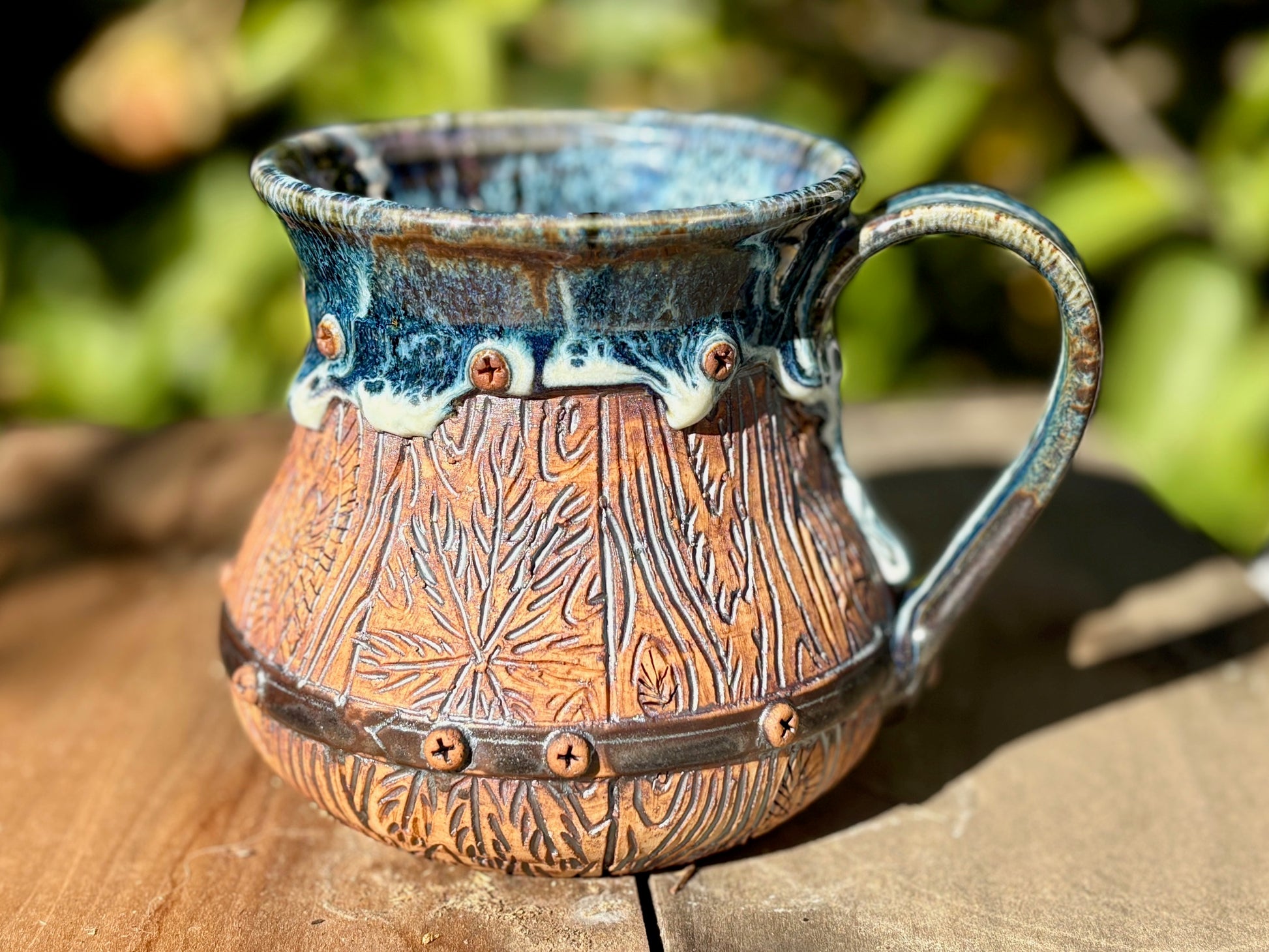 This wide bodied, hand carved holiday mug comes with a frosty blue and white glaze combo running down its wood grained body.