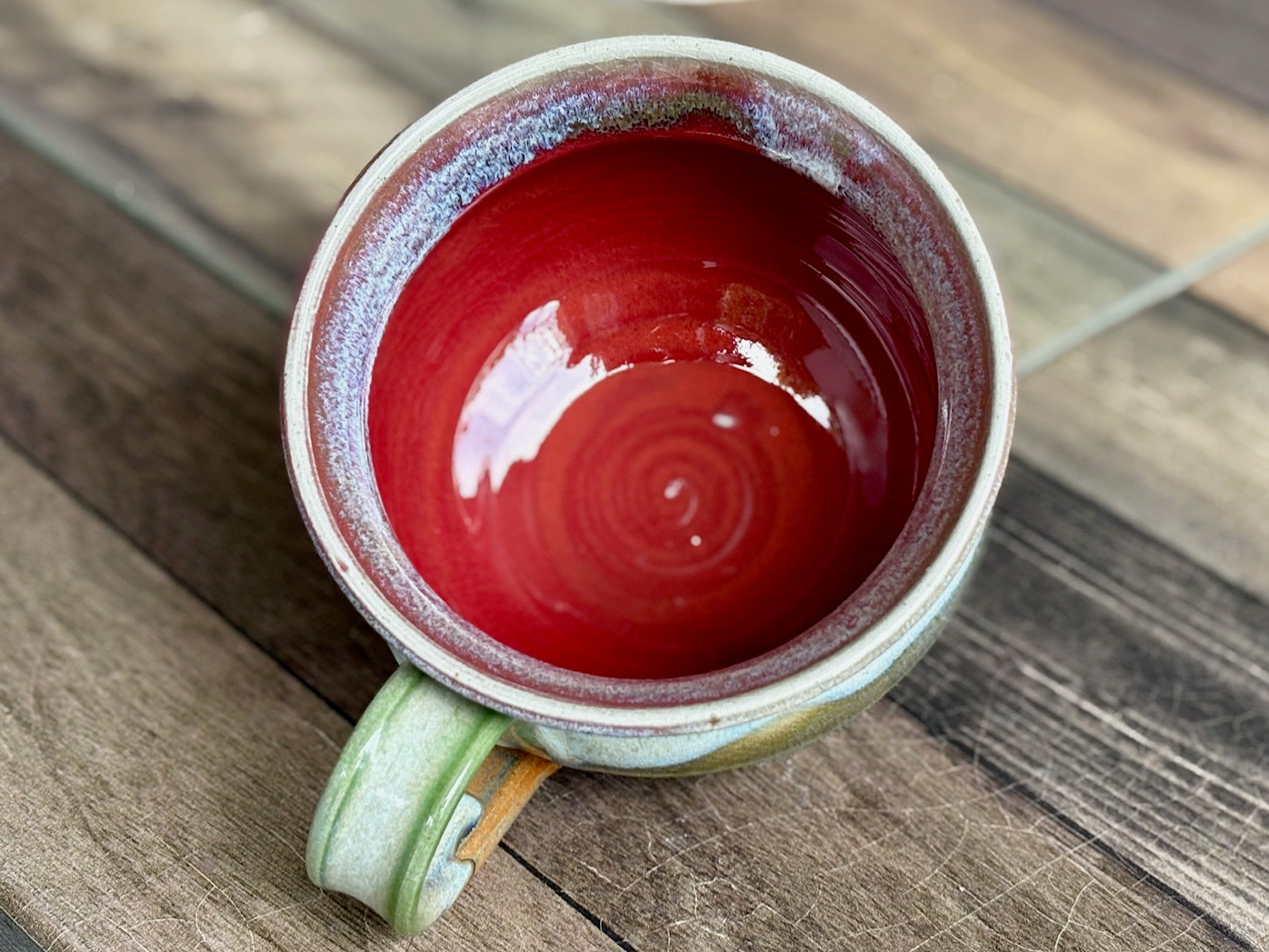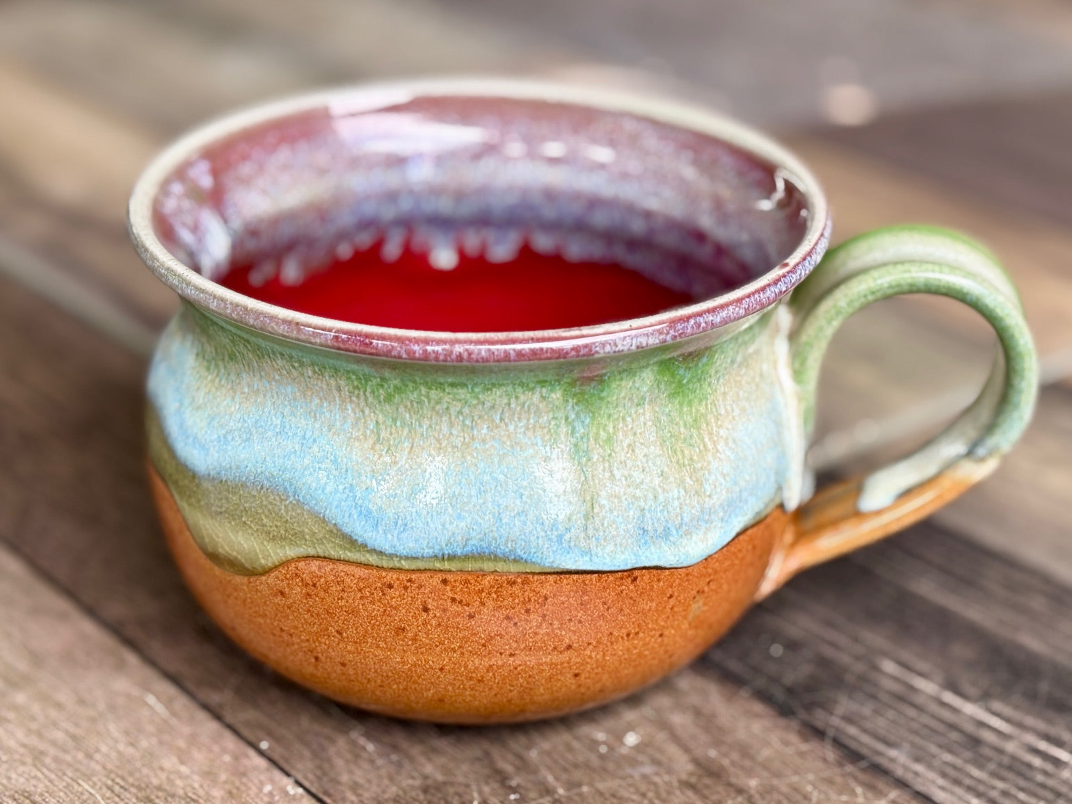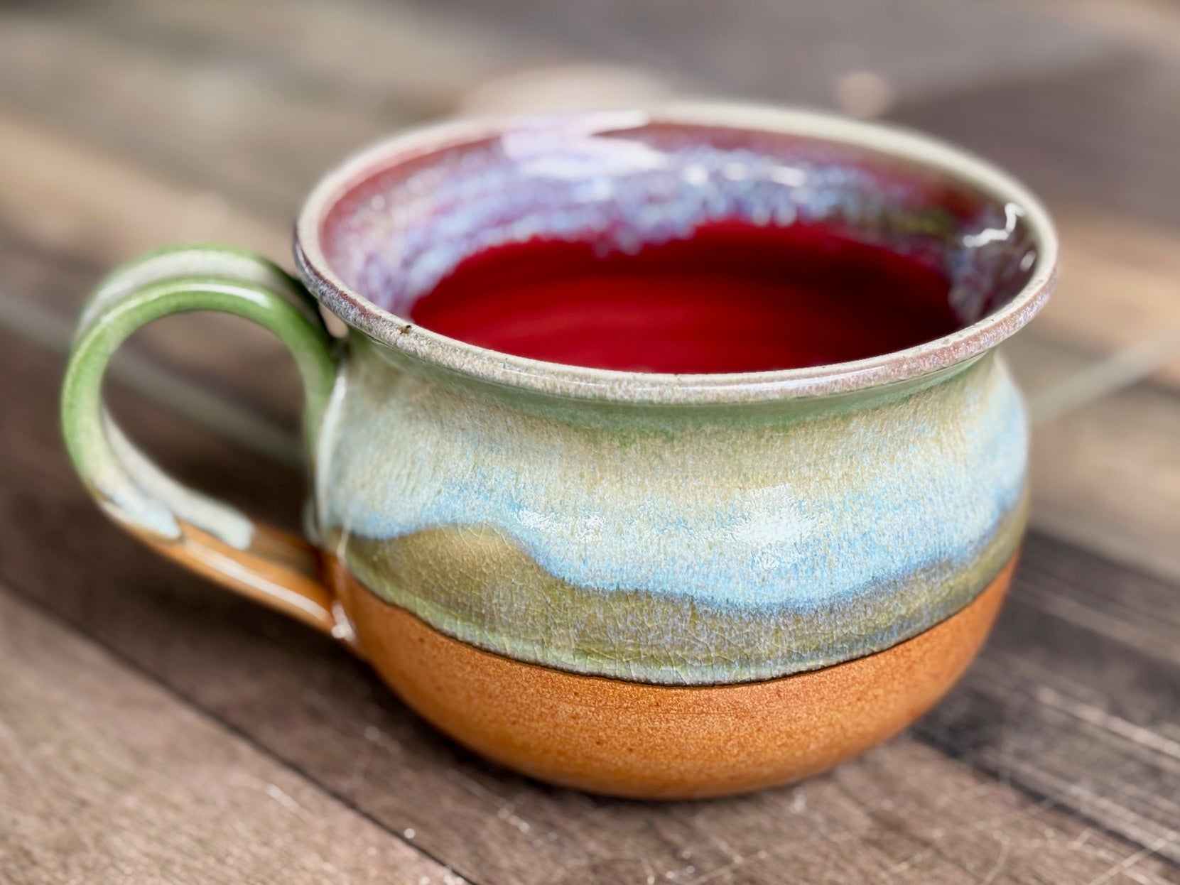 This bowl has a green and blue glaze connecting with a desert-orange glaze on the body of the piece which is really awesome. The inside is glazed a bright red like a summer sunset in Joshua Tree. It is perfect size for chili while camping or chilling on your porch.