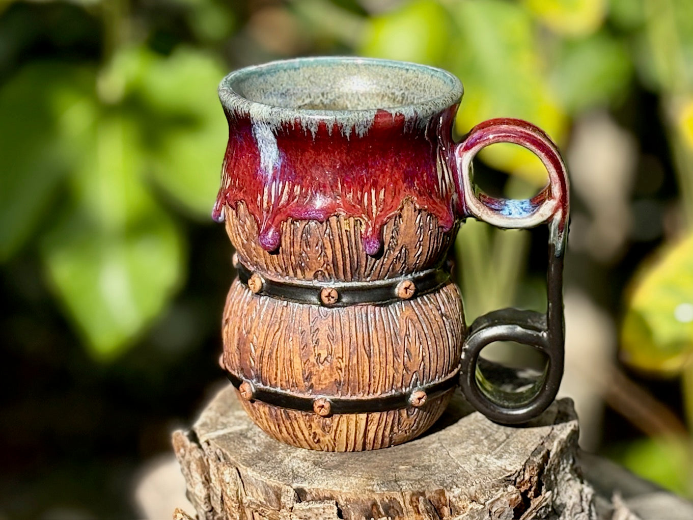 With a ruby red glaze, this wood grained cask comes with a handle which supports a comfortable "full grip" so you can enjoy a hefty amount of your favorite brew every time!