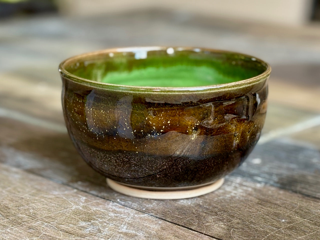 A true chili bowl in the sense, this green glazed beauty will be perfect for your backyard chili cookoff, or a bowl of your favorite ice cream!